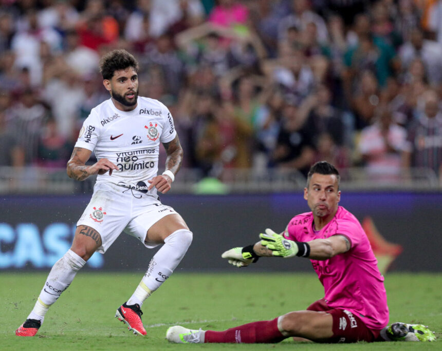 Gol do Corinthians! Aos nove minutos, Maycon puxou o contra-ataque e enfiou para Yuri Alberto. O camisa 9 do Timão, de primeira, deu um tapa com classe, de perna direita, por cima do goleiro Fábio, um golaço, abrindo o placar no Maracanã!