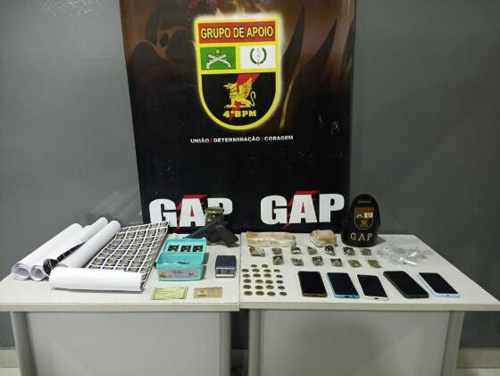 Os policiais apreenderam uma barra de maconha, 21 porções do mesmo entorpecente, um simulacro de pistola e diversos materiais para embalagem e comercialização dos ilícitos.