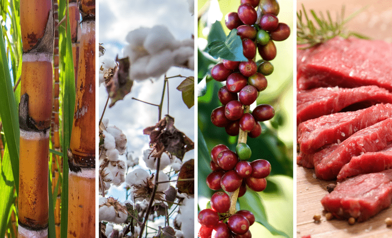 De acordo com a secretaria de Comércio e Relações Internacionais do Ministério da Agricultura e Pecuária (SCRI/Mapa), quatro produtos explicam o forte crescimento das exportações em fevereiro de 2024: açúcar (+ US$ 1,06 bilhão), algodão (+ US$ 406, 55 milhões), café verde (+ US$ 313,06 milhões) e carne bovina (+ US$ 211,65 milhões).
