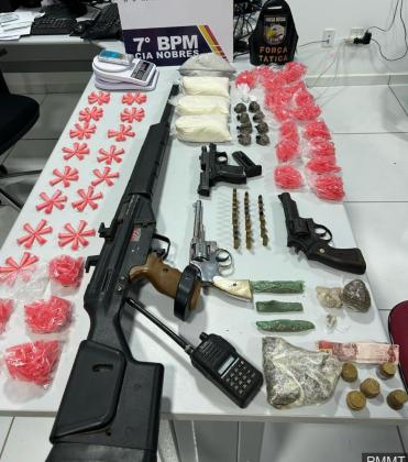 Policiais militares do 2º Comando Regional prenderam seis adultos e apreenderam dois adolescentes em flagrante por formação de quadrilha, tráfico de drogas e porte ilegal de arma, na noite desta terça-feira (09.01), em Nobres. Com o grupo, a PM apreendeu mais de 100 porções de cocaína e maconha, armas de fogo e um simulacro de fuzil.