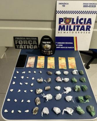 Jovem de 18 anos foi presa por tráfico de drogas na noite desse sábado (9), em Campo Novo do Parecis (396 km a noroeste de Cuiabá). Cerca de 29 porções de substância análoga à maconha e 25 porções de pasta base de cocaína foram apreendidas.