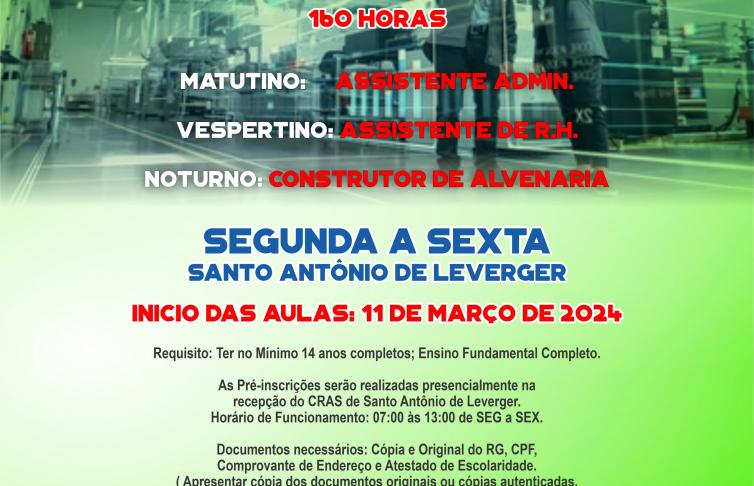Com o objetivo de fomentar o mercado de trabalho, com geração de oportunidades de empregos, para pessoas de baixa renda, a Prefeitura de Leverger, por meio da Secretaria de Assistência Social, tendo SENAI (Serviço Nacional de Aprendizagem Industrial), como parceiro, está com inscrições abertas para os cursos técnicos gratuitos.