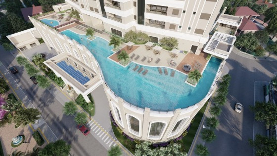 Nos empreendimentos imobiliários de alto padrão, todos os detalhes são grandiosos e projetados para impactar. Até os itens mais comuns nos verticais residenciais, como as piscinas, chamam a atenção diante de novos conceitos de designer. A gigante torre Baalbek, do Grupo São Benedito, em construção no bairro Santa Rosa, emerge como um ícone de luxo e exclusividade. A torre com 183 metros de altura impressiona com a piscina, uma verdadeira obra-prima inspirada na mais famosa do mundo; a piscina do 57° andar do hotel Marina Bay Sands, em Cingapura.