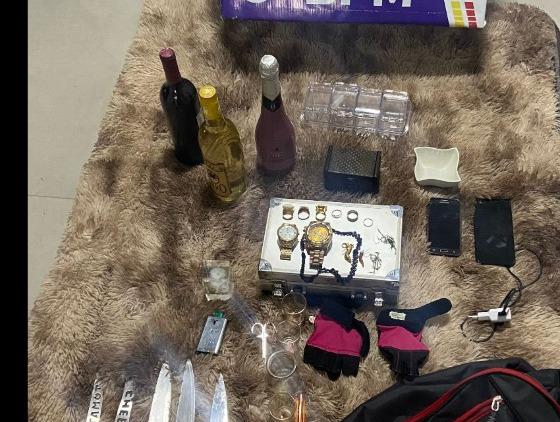 Durante busca pessoal, as equipes localizaram diversas joias, alianças e relógios. Eles ainda portavam facas, uma luva e garrafas de bebidas. Questionado sobre os produtos, eles afirmaram que tinham invadido uma casa na região. Os suspeitos levaram os militares até a residência, porém, não havia ninguém. Para entrar no local, o trio danificou a cerca elétrica e pulou o muro dos fundos.