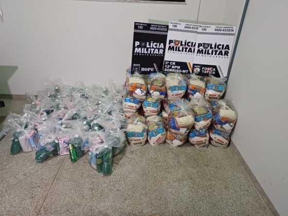Ainda pelo imóvel, os militares localizaram 38 cestas básicas e 37 kits de limpeza. Questionado sobre o material, o suspeito disse ter recebido de membros da facção criminosa para fazer a distribuição em alguns bairros do município. Entre as sacolas, a PM também localizou uma embalagem contendo seis porções de maconha.