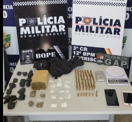 Policiais militares do 12º Batalhão prenderam, nesta terça-feira (27.02), um homem de 25 anos suspeito por tentativa de homicídio, organização criminosa, porte ilegal de arma de fogo e tráfico de drogas, no bairro Morada do Parque, em Sorriso (397 km de Cuiabá). Com o suspeito, os militares apreenderam 31 porções de entorpecentes, 91 munições e dois artefatos caseiros explosivos.