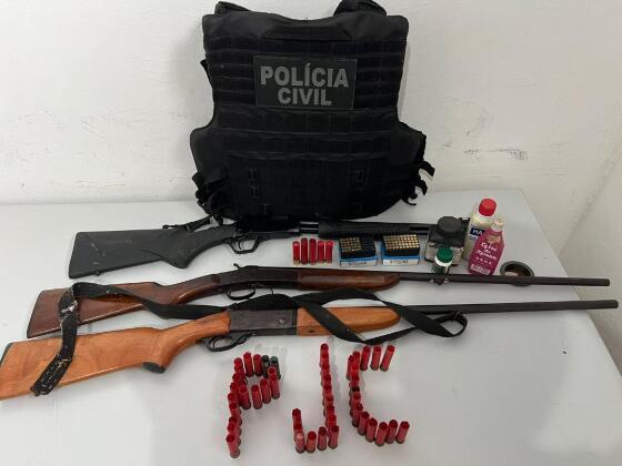 Foram apreendidas três armas de fogo (uma espingarda CBC calibre .28, uma espingarda Rossi calibre .32 e uma espingarda CBC calibre .22); além de 53 cartuchos de diferentes calibres; 80 munições de calibre .22, recipientes contendo apetrechos para recarga de cartuchos de arma de fogo como balotes de chumbo e pólvora, celulares, porções de maconha e crack, balança de precisão e quase R$ 900 em dinheiro.